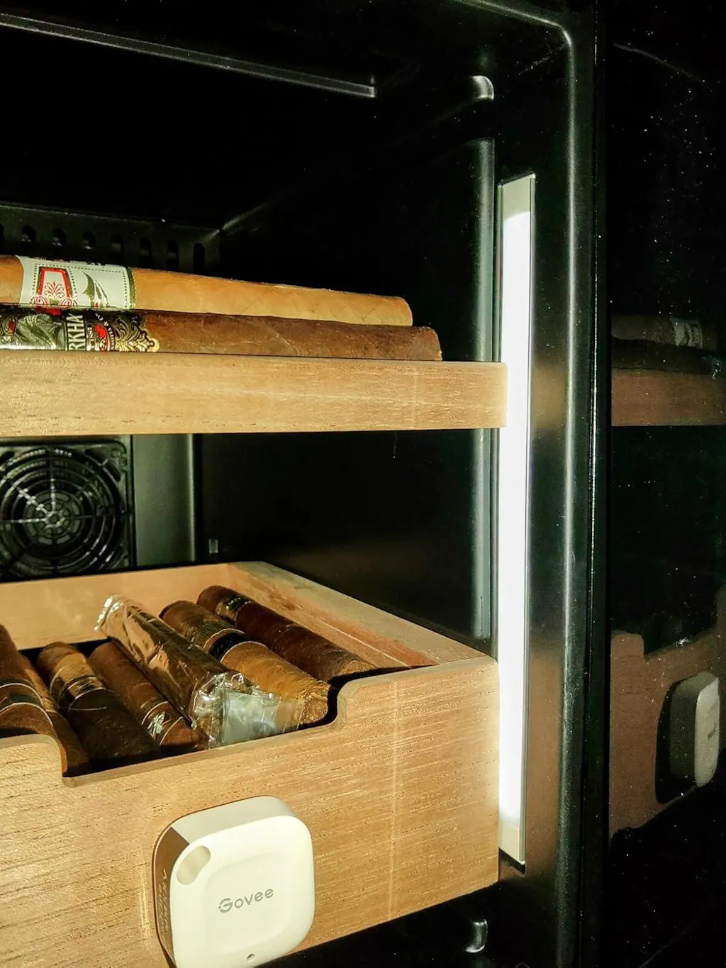 Yes, it includes automatic humidification and dehumidification, with a built-in sensor keeping the RH level between 65%–75%—perfect for long-term cigar storage.