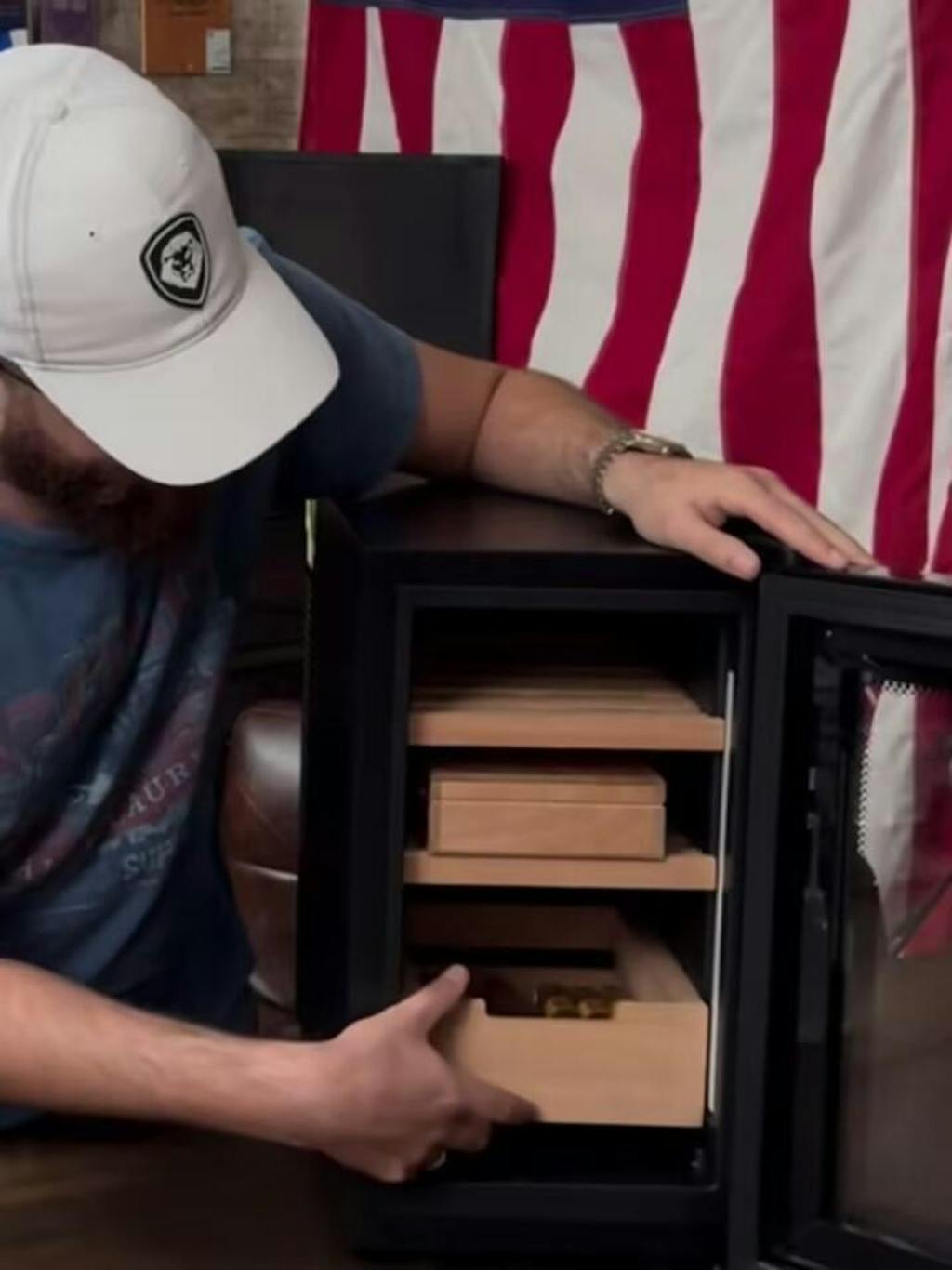 The 23L Pro model can hold up to 150 cigars, depending on the ring gauge and how they’re arranged on the shelves and drawer.